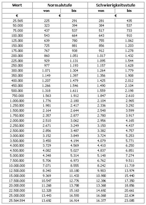 (1) Die Mindest- und Höchstsätze der Honorare für die Ermittlung des Wertes von Grundstücken, Gebäuden und anderen Bauwerken oder von Rechten an Grundstücken sind in der nachfolgenden Honorartafel festgesetzt